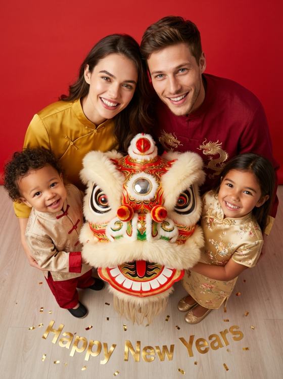 Create a unique Chinese New Year family portrait AI or a cute pet photo. Our AI preserves facial details while adding traditional festive attire and decorations.