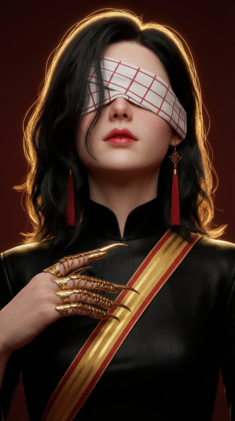 Femme Qin Shihuang Ragnarok Twilight, la tête de la beauté orientale est légèrement inclinée, avec des cheveux bouclés noirs mi-longueurs naturellement pendants couvrant la moitié du visage, un masque pour les yeux en tissu blanc avec un motif à carreaux rouge enveloppé diagonalement, une chemise ajustée à col haut noir, un ruban à rayures dorées et rouges sur le corps diagonalement, une griffe de mille-pattes dorée gauche qui s'étend vers l'avant, des boucles d'oreilles dorées exquises avec de longues franges rouges, la tête penchée vers l'arrière pour montrer une ligne de cou élégante, une posture légèrement tournée du corps, un rendu 3D ultra réaliste |