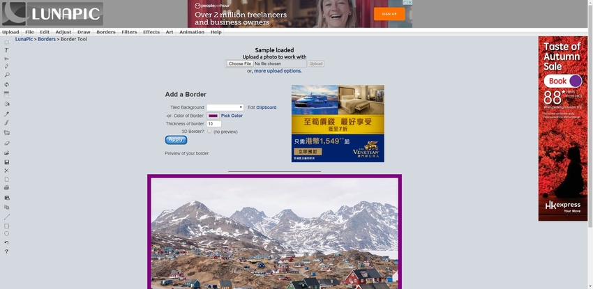 This free online tool can customize and animate GIF based on user’s preference. In simple steps, you can add filters, add borders, as well as add frame to GIFs. You only need to upload files, there’s also the option of uploading multiple files. To add border, upload the file of choice, select tile background or preferred border color, border thickness or 3D border if preferred. Below the dialogue box, you can preview the changes to your desired preference, and if edited to satisfaction, click on Apply button.
