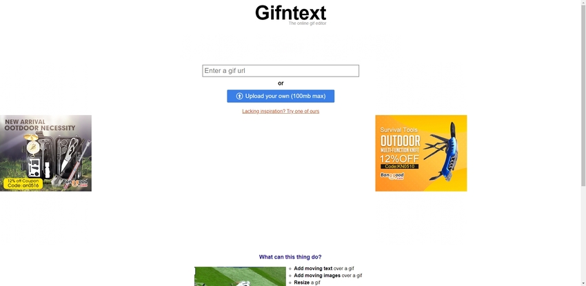 GIFNTEXT with a simple user interface, and it has the edit features where user can add text in various fonts and colors to their GIFs. It also supports crop, moving images, draw over GIF. It allows the user to upload pictures or GIFs of up to 100MB for editing.