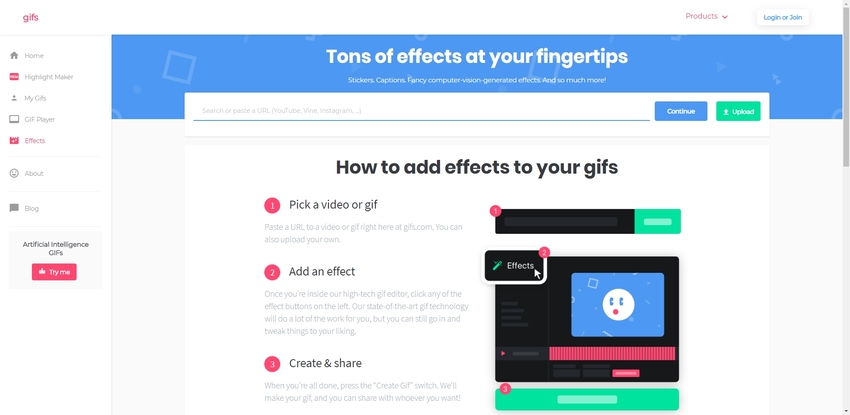 GIFs provide the user with tons of effects that can be added to their GIF, e.g., stickers, captions, filters, black & white effects, padding, and others. Only three steps, you can create your funny GIF. People could paste Youtube, Instagram, and other URL links to GIFs or upload from the computer. Secondly, edit their unique GIF. The last step is to create and share to their social media.
