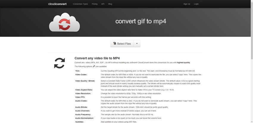 Cloud Convert website is also a lovely option to add audio to GIF format files. This website converts the files in MP4 format online without any installation on the computer. The site is not only capable of turning the GIF to MP4, but also you can convert audio, video, images, archive, documents, and many other types of files in the needed formats with ease. The website works online, and you can do all your conversions online without any installation on your system.