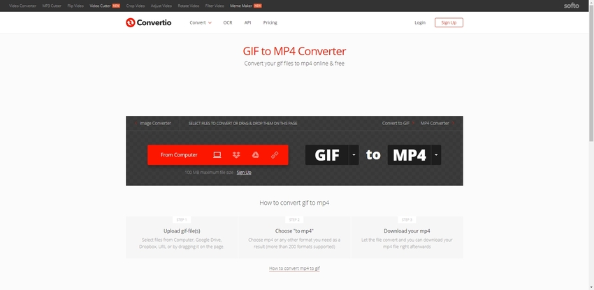 Convertio is another online GIF to MP4 converter which allows users to convert GIF to MP4 format, and then they can create GIF with sound. This website is also easy to use and saves the files at a faster speed without any software installation. Convertio website also offers you paid pricing plans where you can convert unlimited files without any limitations issue. There are some other converters also provided by a website such as audio, video, presentation, EBook, archive, etc.