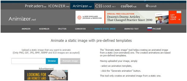 Icon8 provides you great deal of ease in converting recently clicked photographs into animated JPG. The animation of still imagery basically takes place on pre-defined templates. This site also offers you great deal of facility to upload your converted files straight to several social media platforms. Moreover, one can also choose multiple image formats for conversion process. The steps for the conversion process are easy to follow thus you find a great deal of ease during the conversion process. When you acquire the facility of this site then there is nothing to worry about as it uses secure connection.