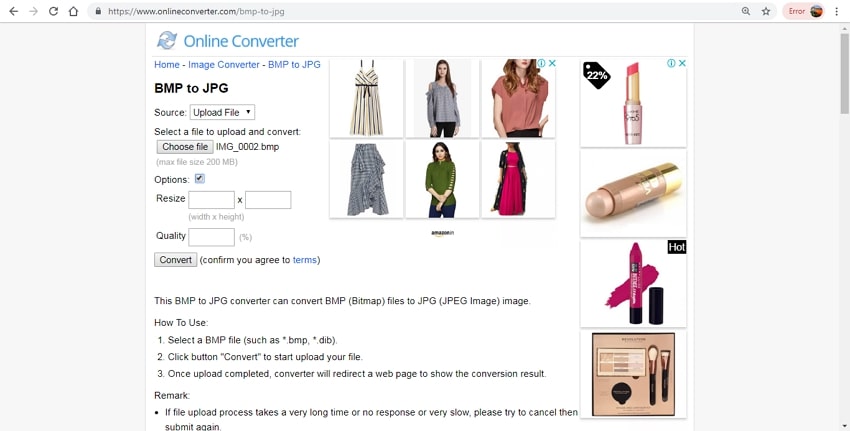 For all types of file conversion needs, a variety of online tools is available. So if you do not want to register for any additional third-party software on your PC, you can opt for one of these online programs to get your BMP files converted to JPG and other popular formats. The online tools are free and operate from your browser.