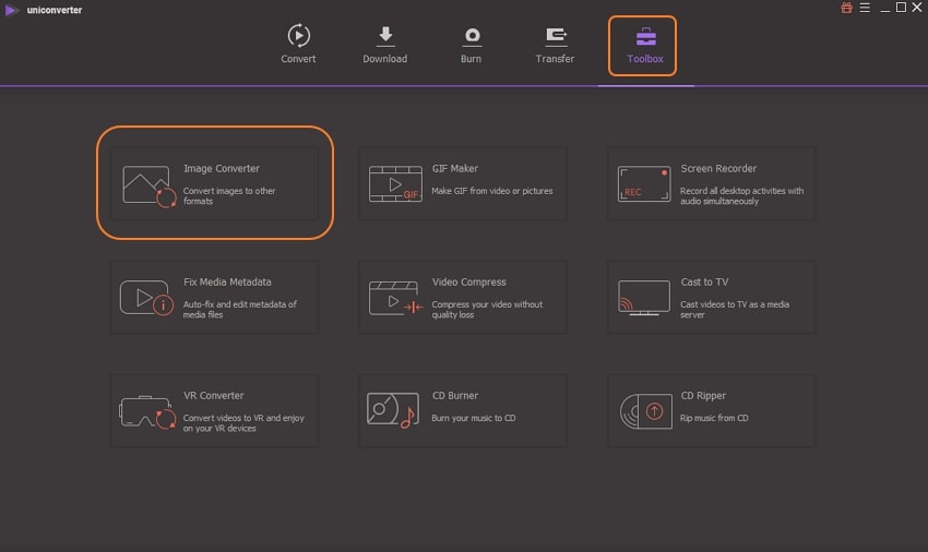 Launch the UniConverter software on your PC. From the Toolbox section on the main interface, select the Image Converter option. A pop-up window will open where you can either click on the + sign or +Add Files button to import BMP images to be converted from your PC.