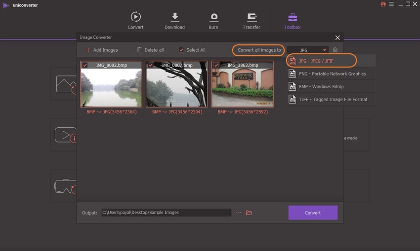 Wondershare UniConverter is multi-functional software that supports converting your BMP files to JPG as well as other popular formats. The software can be downloaded to all popular versions of the Windows and Mac system for lossless quality conversion at super fast speed. Batch processing feature of the program further facilitates converting multiple files at a time. Using the software, you can even edit and change the image size and the quality as needed. In addition to image conversion, Wondershare software also supports a wide range of other functions like video conversion, video download, compression, disc burning, GIF making, and video editing.