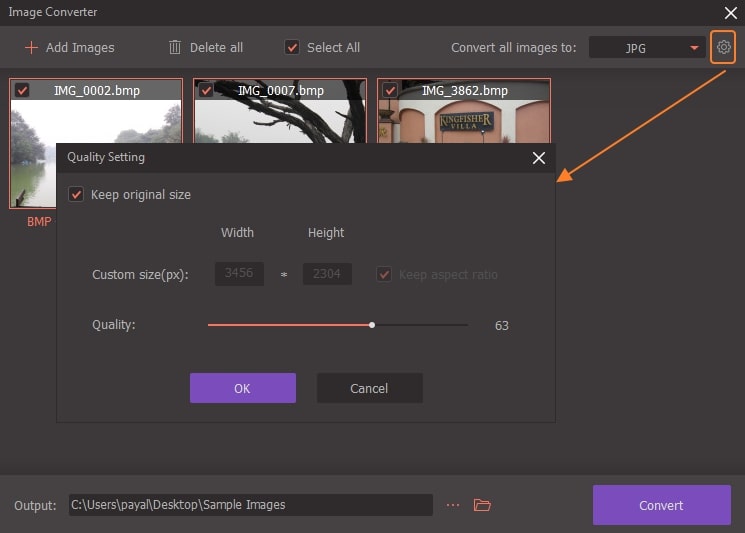 Once all BMP images are added, expand options at Convert all images to: tab and select JPG as the format. Click on the settings icon next to the format select and a new pop-up window will open. Here you can choose the desired file size and select the quality by moving the slider. Click on the OK button to confirm the changes made.