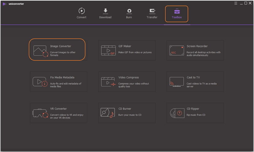 The first step would be to download, install and launch Wondershare Uniconverter. Once you are done, go to the Toolbox option and click on Image Converter to get started.