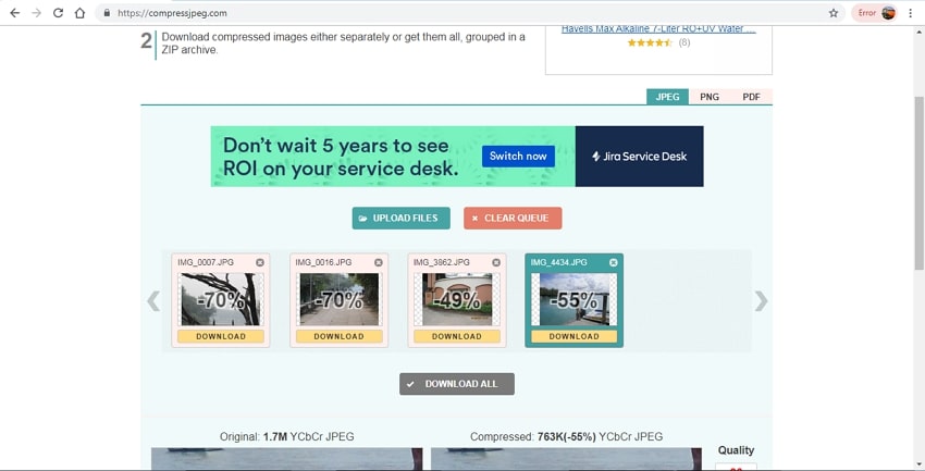 This is a simple online program that works straight from your browser for compressing JPG images. Using the tool maximum of 20 files can be added at a time for the process. Once added and uploaded, the program starts shrinking the file size automatically and after the process, you can download them to your PC separately or choose to download them in a ZIP archive. There is also an option to choose the output image quality as desired.