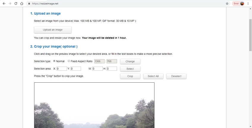 Using this online tool, you can shrink JPG as well as other image formats in decent quality. Maximum supported file size of 100MB and 100MP and for the GIF format, the supported file size is 30MB and 10MP. The program has an option to crop the image by specifying the selection area. You can even choose the file to have a fixed aspect ratio or change it as needed. File rotation is also supported if required. To compress and resize the added images you can choose the percentage or specify the exact size. Option to keep the background transparent or choose the color from the available options is also there.