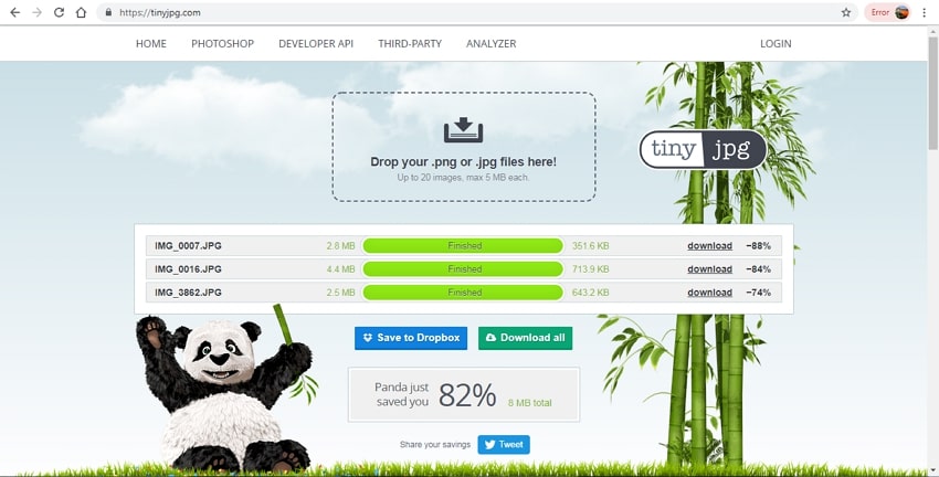This is a popular and widely used online program that facilitates shrinking JPG and PNG images in decent quality. The program analyzes the added images and then applies the best encoding method and strategy. The program allows adding 20 images at a time with a size of 5MB each. The output image is good in quality and the process is also fairly fast. The converted images can be downloaded to your PC or can be saved to Dropbox.