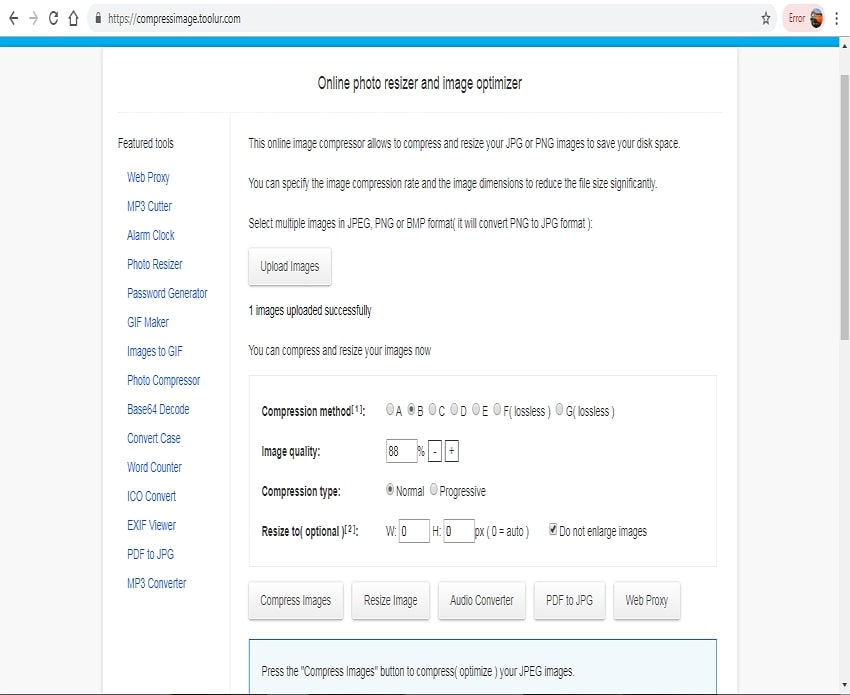 This is a simple to use program that allows compressing JPG online a few simple steps. Using the tool, the compression level can be selected as desired. Lower the compression level, smaller the file size and lower the file quality. If needed, you can even resize the image added by specifying the width in terms of pixels. The processed file can be downloaded to your PC.