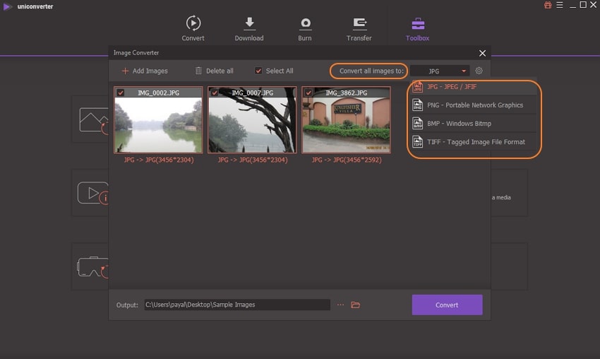 After all the files are added to the interface, choose the output file format from the options available at the drop-down menu at Convert all images to: tab on the top-right corner.
