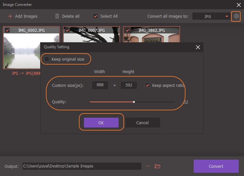 Next, to the selected output format, click on the settings icon and a new pop-up Quality Setting window will open. Here disable the check-box at Keep original size and then select the desired file size. Next, select the file quality by moving the bar. Clicking on the OK button to confirm the selected parameters.