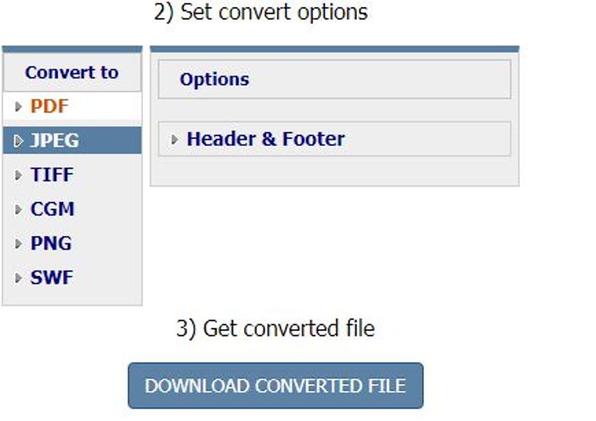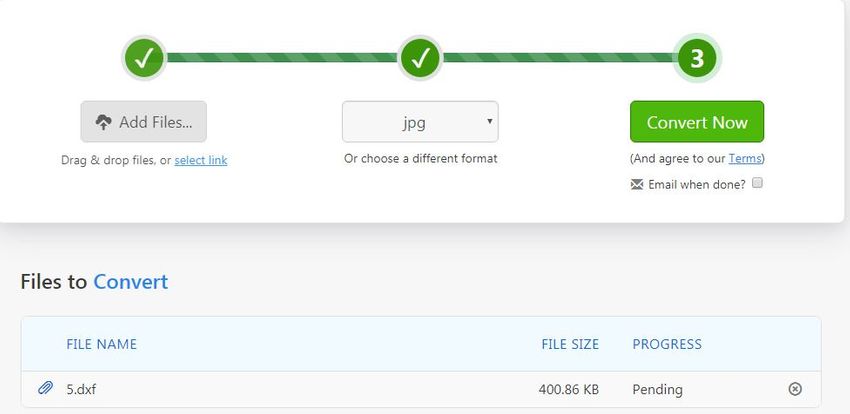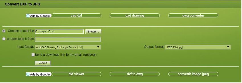 Convertfiles is an online file converter which is used to convert DXF to JPG in a matter of few seconds. You just have to follow three initial steps after which you will be able to download your file or can even upload the image straight to your email. This online software converter also provides you an option either to upload a file from your personal computer or from any other link.