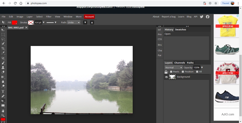 You can edit the PNG image online using this free tool. This advanced image editor allows you to create a new image or add the exiting one from your system. The created work as can be saved as PSD, JPG, PNG, or SVG file as needed. The program supports a wide array of editing functions, and some of the popular ones include cropping, brushing, closing, adding text to the image, adding a background, and others.