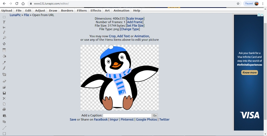 Local as well as online images can be added to this free PNG editor that works directly from the browser window. The file once attached is uploaded to the program and is then available for customization in several ways, including adding text, cutting, cropping, adding effects, and others. The program also features a transparent background tool where you can add a transparent background to your image. Caption if needed can also be added to the file. Additionally, the software also allows sharing the edited image on social media platforms like Facebook, Twitter, Imgur, and others.