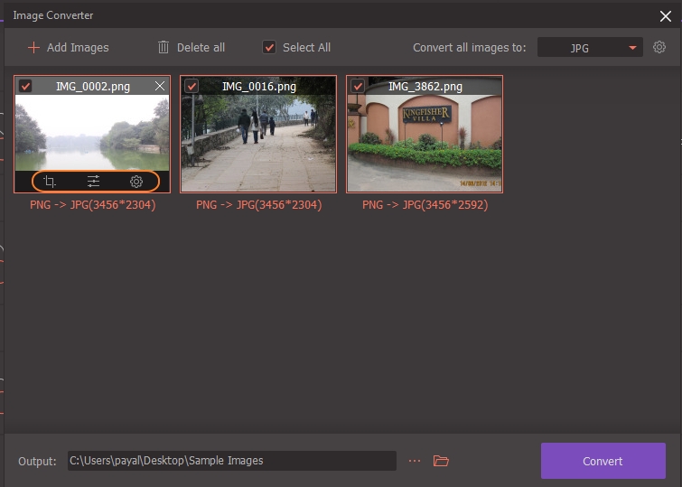 Choose the output format from the options available at Convert all images to: tab at the top-right corner.Settings icon here can be used to change the size and quality of all the added files at a time.