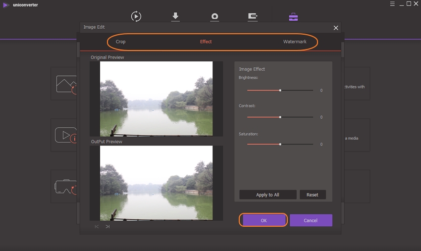 The added image appears on the interface with a thumbnail image. Move the cursor over the image and the editing icons from Crop, Effect, and Settings will appear. Click on the desired icon and a new window will open. Make the needed changes and click on the OK button to confirm the same.