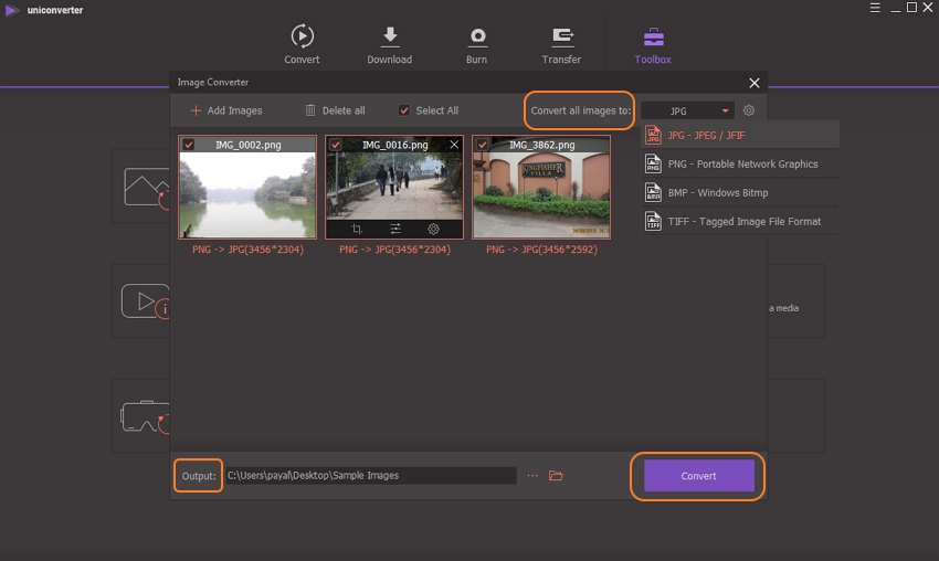Download, install and open the Wondershare UniConverter software on your system. Click on the Image Converter option from the Toolbox section. From the new pop-up window, hit on the + sign or + Add Image button to browse and load the PNG files to be edited.