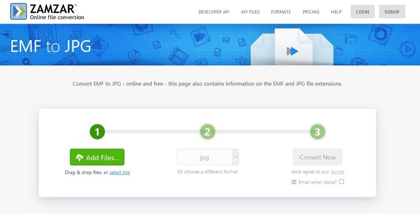 Zamzar is a very popular online EMF to JPG converter website which fully supports mostly image formats including some CAD formats as well. This website is free of cost to convert the files and download in your needed format on your system. There is an option offered on the website which allows you to receive the files via Email when the conversion is done. You can then download the files from the received link in your mail.