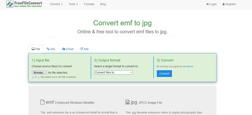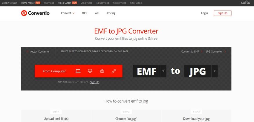 Convertio is also a very nice option for you to convert EMF to JPG if you are facing issues in opening the file. This website also supports so many kinds of other files conversion so you can convert PDF documents, Microsoft word files, videos, and other multimedia files, etc. On the website, you also get the option to convert files directly from DropBox, Google Drive, and URL of photos.