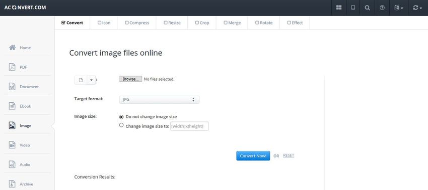 AConvert website is also a very nice way to convert EMF to JPG format using the internet and browser directly. This website not only supports conversion of EMF files but also you can easily crop, merge, rotate, resize and compress the photos using this EMF to JPG online tool. Just like the other online converters this website also supports converting many other types of documents such as multimedia files, presentations, and Microsoft office files.