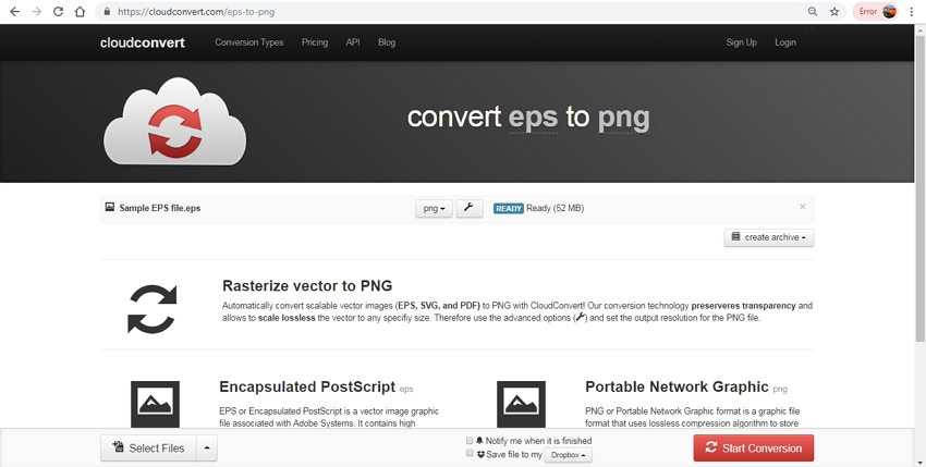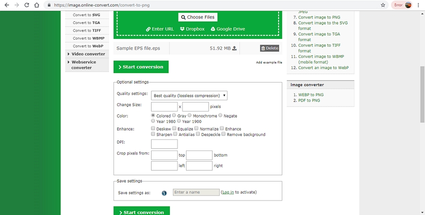 This is a decent EPS to PNG Converter online tool that is simple and quick to use. Files present in the Google Drive, Dropbox, computer, and on the link can be processed in decent quality. Quality and size of the output file can be edited is required. Option to crop the file, choose DPI, and enhance the file is also there.