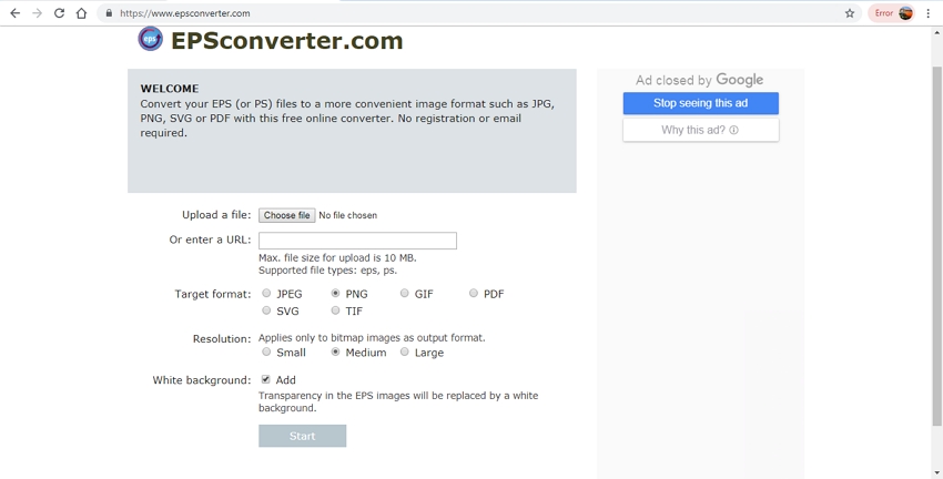 Maximum of 10MB EPS file can be added and processed at a time using this browser-based program. The supported output formats are PNG, JPEG, PDF, GIF, SVG, and TIF. Option to choose from small, medium, and large resolution is also there. If required, a white background can also be added to the file.