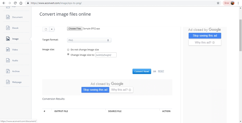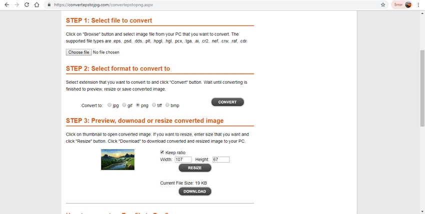 AConvert allows processing EPS files on your computer, link, and cloud storage. Several formats as target files are supported by the tool. Option for resizing the file by specifying its height and width is also there. The converted files need to be downloaded to the computer from the program interface.