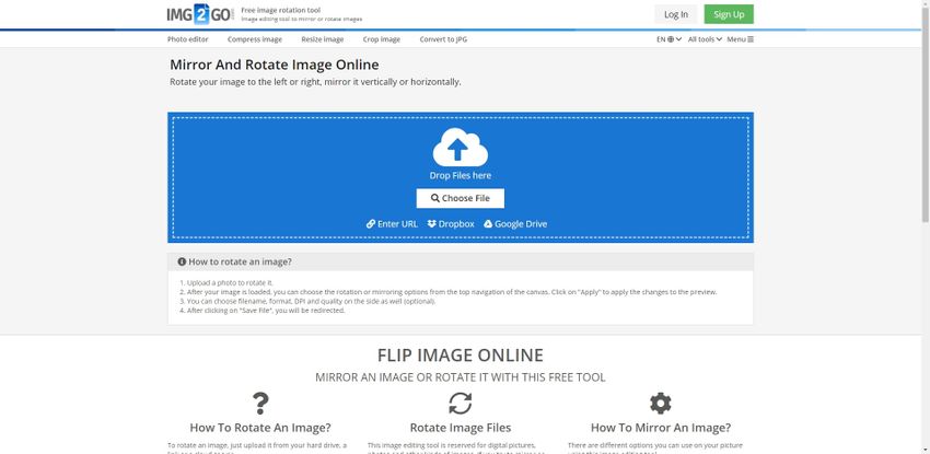 Img2go is one of the best tools to rotate the image right or left or mirror it vertically or horizontally. All you need to do is to upload the image by clicking on the choose file button. You can also enter the URL, or upload an image from DropBox or Google drive. Once, the image is uploaded, you can select from options like mirroring or rotation. You also get additional options like format, quality, and DPI at the side. After you click o save the file, the page will redirect you, and you will get your desired image.