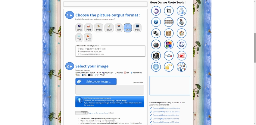 Convert Image is also an excellent converter option which enables users to quickly convert GIF to ICO format without any installation on the computer. This website supports JPG, PNG, GIF, ICO, PSD, TIFF, PCX, and PDF format for converting the images. For the input, you can insert PNG, PSB, PSD, TIF, XCF, PCB and several other formats. You can select any format image from the list above and convert in your needed formats.