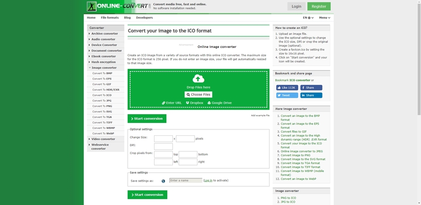 Online Convert as the name of the website defines its feature. This website is capable of converting GIF format files in the ICO icon format. It is purely a converter website which supports so many different types of data conversion with ease. It works online, and there is no need to install any software on the computer to use the converters of the website. For the quick conversions, it offers you a free plugin which can be installed in your browser for files conversion.