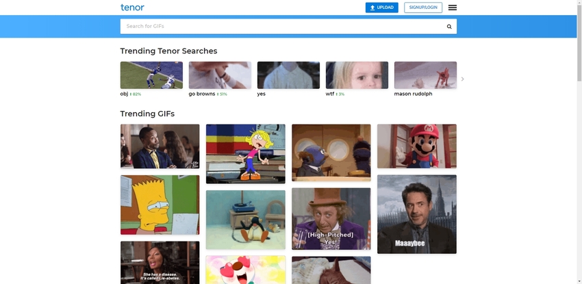 Asides being welcomed by multiple exciting GIFs; you have the option of knowing what GIF is currently trending by percentage. You also have the option of uploading your funny memes to the platform. You can also search for befitting memes and GIFs for your newsletter, blog post, or any of your social media platforms to convey mood and expression.