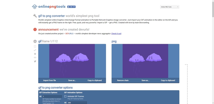 ONLINE PNG TOOLS is known as the world’s most straightforward GIF animation to PNG image converter. All the user needs to do is upload or paste URL of GIF, edit and convert the GIF to pictures in the editor on the left, leaving you with a PNG frame on the right. The tool is quick, free, effective, and powerful. In just simple, easy steps, you import GIF and get your converted image.