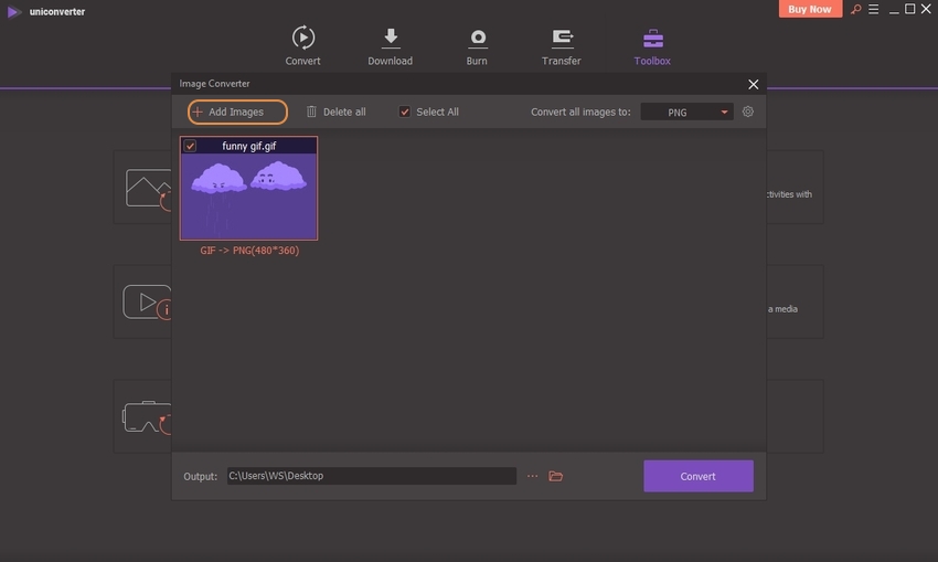 Launch Wondershare Uniconverter, then go to Toolbox at the top of the UniConverter and click on Image Converter option.