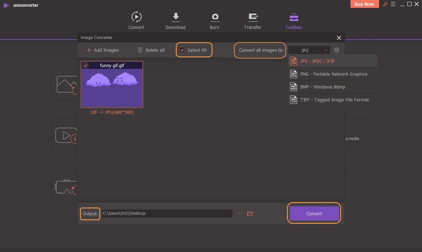 Upon selecting the GIF file of choice, you could change the image output format to JPG, PNG, TIFF, and BMP. After choosing the image form, click on the Convert button to start to convert GIF to images. Conversion process commences, then you have your images converted in seconds.