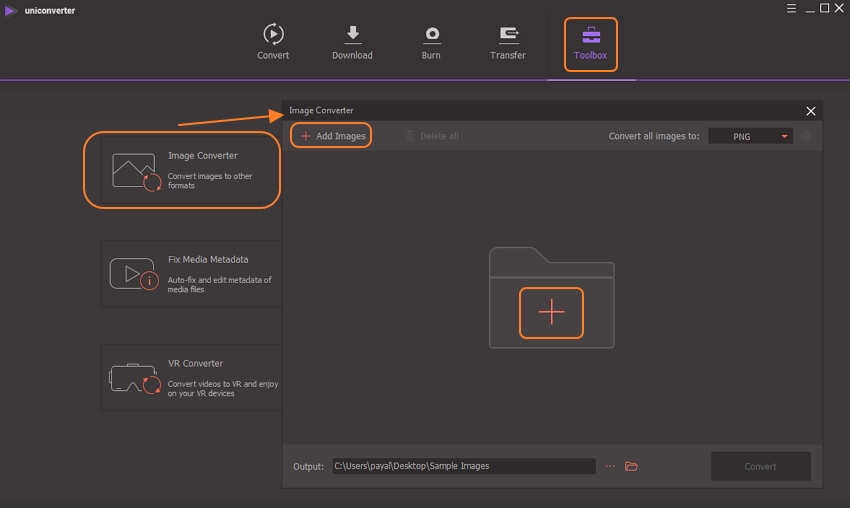 Run the Wondershare UniConverter software on your system. On the Toolbox section from the main interface, click on the Image Converter option. A new window will open from where you can browse and load the local images by clicking on the + sign or + Add Images button.