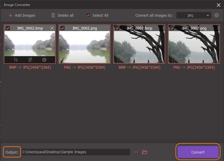 The File Location tab can be used for selecting the desktop location to save the converted files. Click on the Convert button to start processing and converting the added images to JPEG image format.