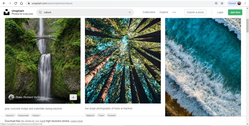 This free site allows downloading high-resolution images in JPEG format. There are several categories like wallpaper, background, nature, animal, and others that can be browsed to get the desired images. The site is simple to use where you just need to mention the category and all the related images will be displayed. Choose the image you want and click on the download icon and the image will be saved to your system. The image also mentions the name of the photographer so that you can give them the credit and also check their other photos.