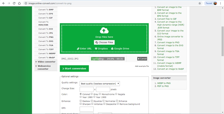 This is a widely used online program that supports conversion of almost all types, including JPG to PNG. Files to be converted can be added from your PC, URL, Dropbox, and Google Drive. The program also provides an option to change the image parameters like quality and size. Option for file cropping, DPI, and enhancing it is also present. The conversion settings can also be saved for future files if needed using this online JPG to PNG tool.
