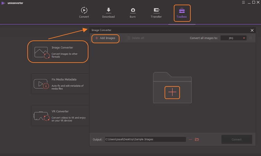 On the main interface, click on the Image Converter option from the Toolbox tab. A new pop-up window will open from where click on the + sign to browse and import the JPG images. Alternatively, you can also click on the +Add Images button to add the pictures. Multiple files for batch processing can be added here.