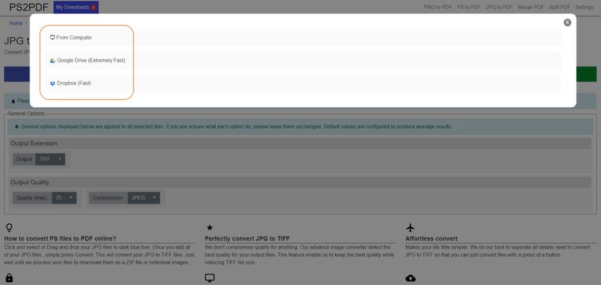 There have three methods that you could upload JPG format to PS2PDF, which are From Computer, Google Drive, and DropBox.