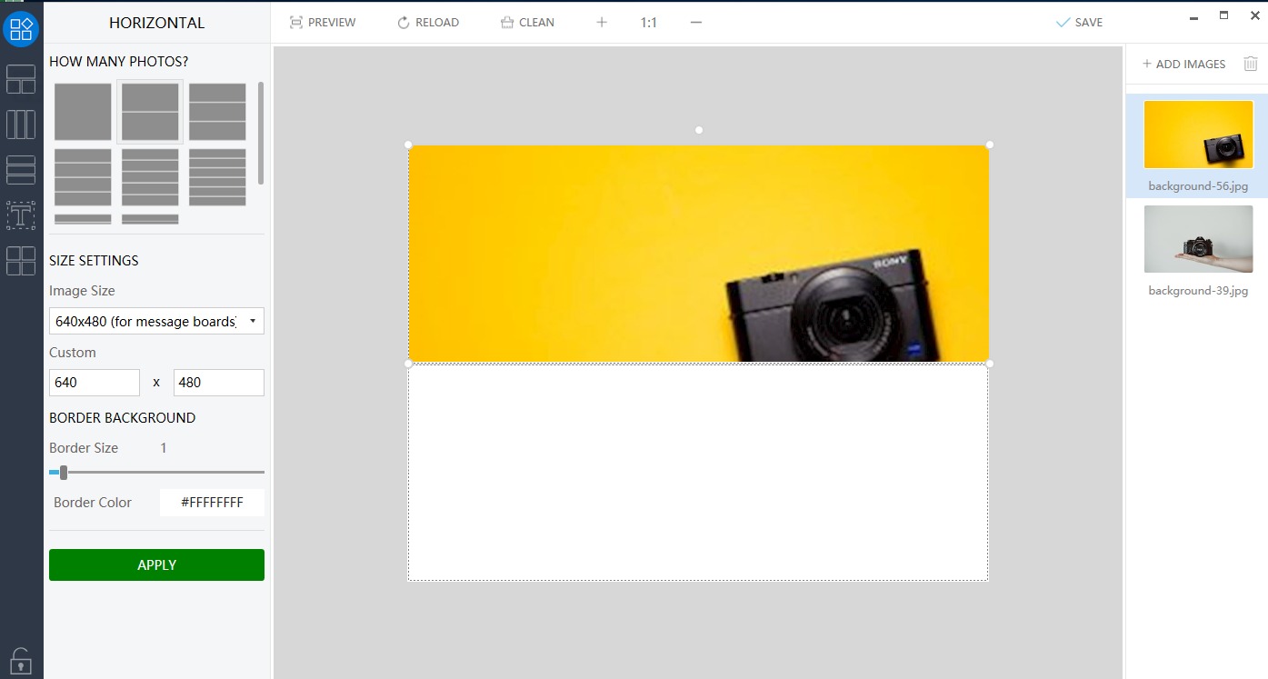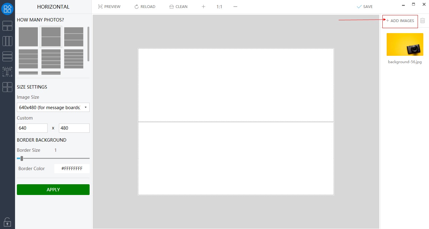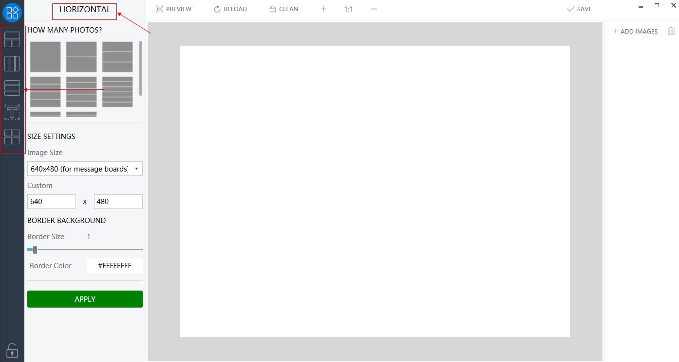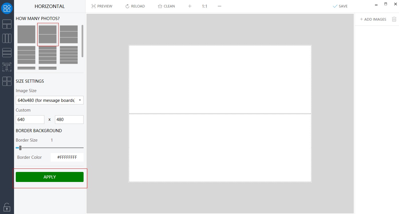 Next, under HOW MANY PHOTOS tab, you need to choose the number of images that you want to merge. Under the SIZE SETTINGS section, select the image size, border size, and the border color. Click on the Apply button to confirm.
