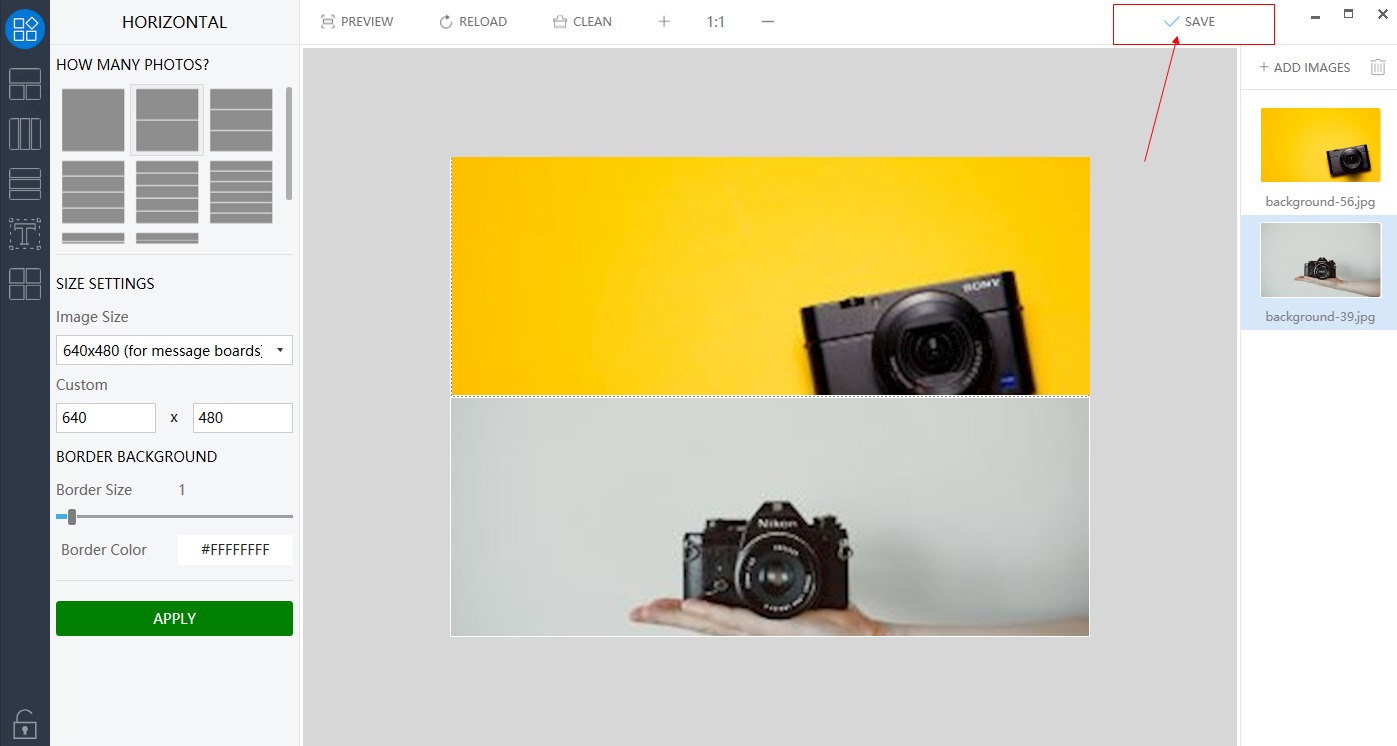Once all added images are dragged to the merging mode design, click on the SAVE button. The merged JPG file in the desired mode is now ready to use.