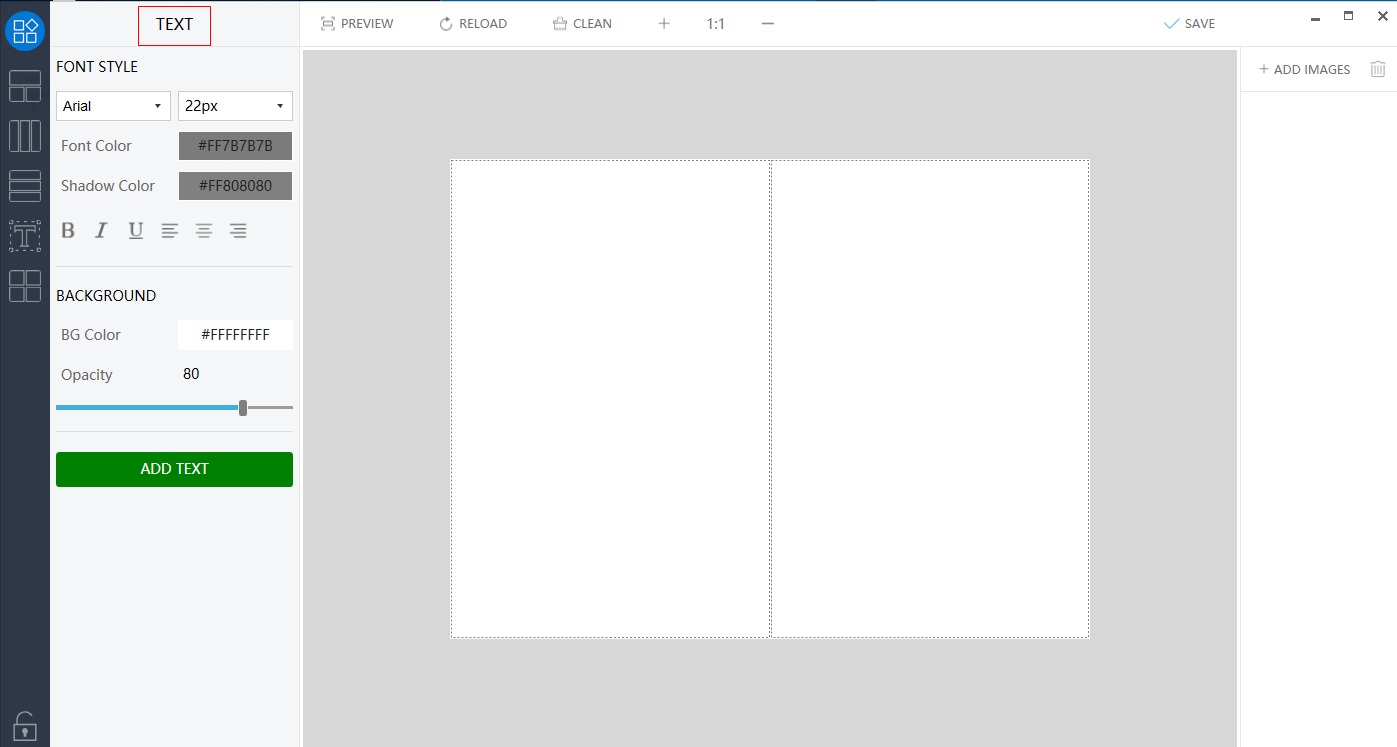 The software also allows you to add text to the merged file. To do so, choose the Text icon from the left panel and a TEXT section will appear. Here choose the font style, color, size, shadow color, and background color if needed. Click on the ADD TEXT button to enter the desired text to the merged image file. Click on the Save to confirm.