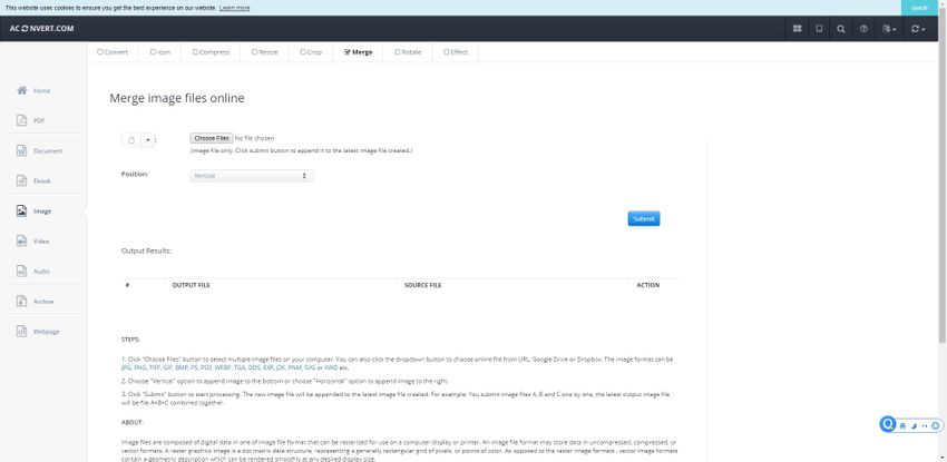 Aconvert is an online platform which provides you a great deal of facility to merge PNG files into one without downloading any pre-requisites on your personal computer. The site is elementary to navigate. Thus, you don’t have to be a connoisseur to handle any project. The website strictly follows confidentiality norms; therefore, your uploaded files will not be shared with a third party. Here you get a chance for automated re-submission if in case the processing fails on one platform.