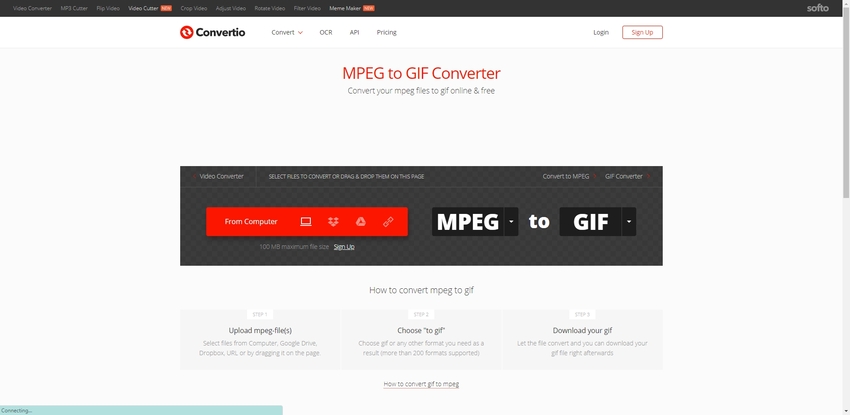 Convertio is an online website which enables you to convert MPEG to GIF as per your need. This website is an online MPG to GIF converter so you can access it directly using your browser without any installation on your computer. On this converter website, there are many other converters offered by developers such as audio, video, document, and many more different types of converters. These all are available for free of cost.