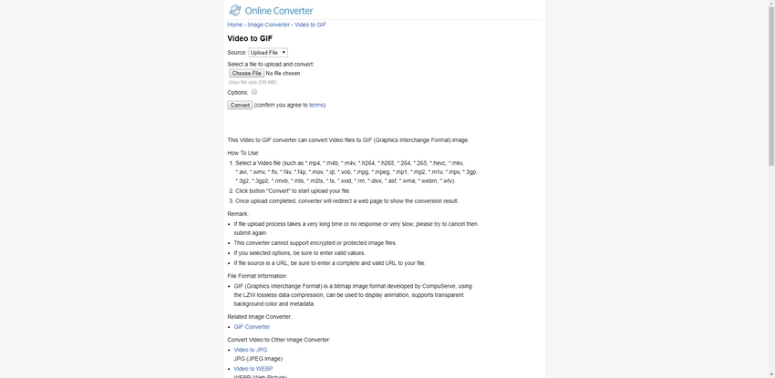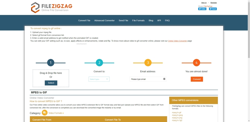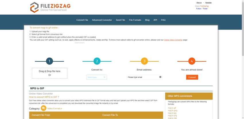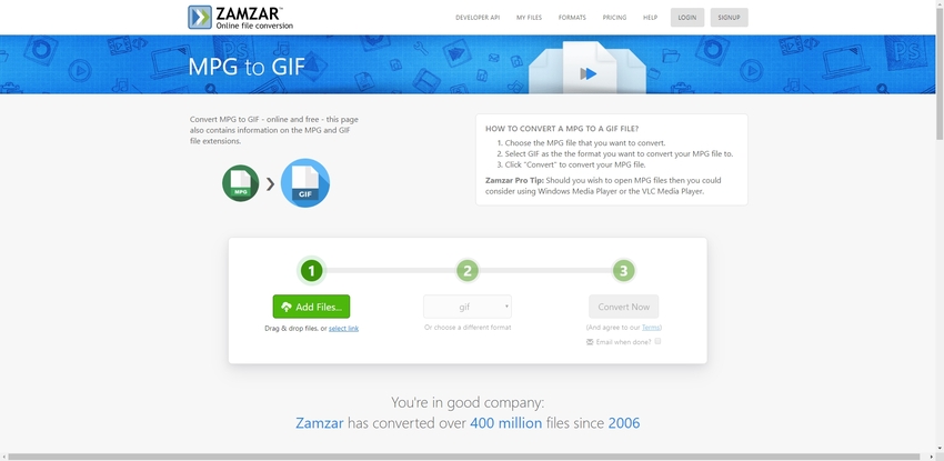 Zamzar is another MPG to GIF converter website for doing the conversion of files online without any installation on the computer. This website is easy to use and supports over 200 formats to convert several different types of data. This is free of cost website, so you don’t have to spend anything, but if you need to remove limitations of size and single file conversion, then you can go for the premium version of the website.